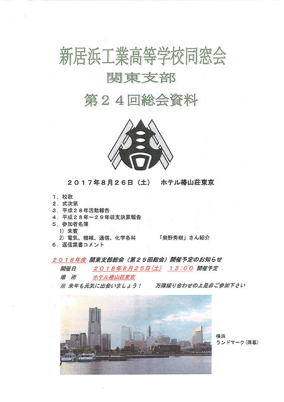 ★平成29年8月26日午後13時より東京都文京区目白「椿山荘」に於いて第24回関東支部総会並びに懇親会が執り行われました。本部からの参加者は10名、近畿支部より2名。総参加者は約45名。