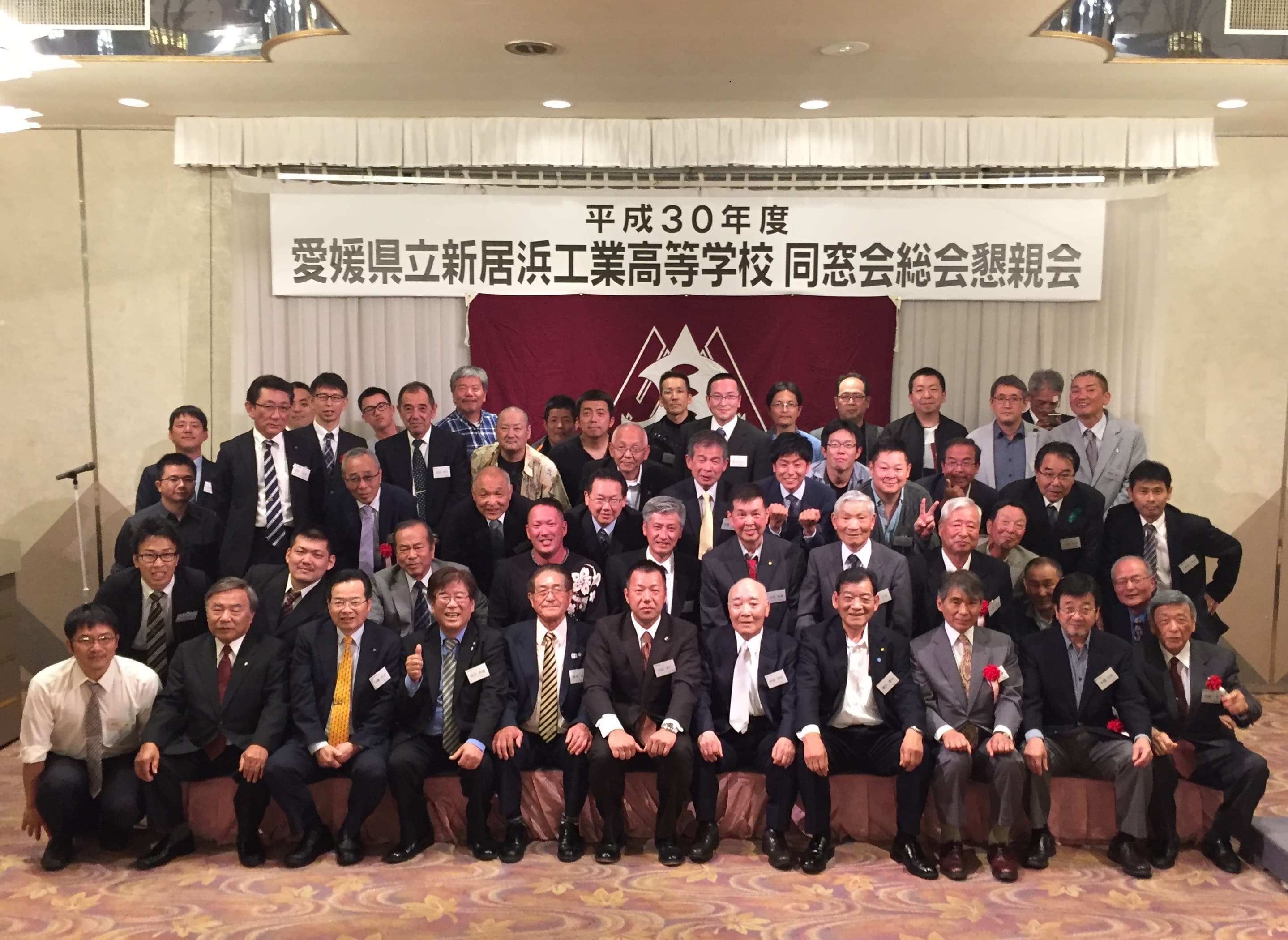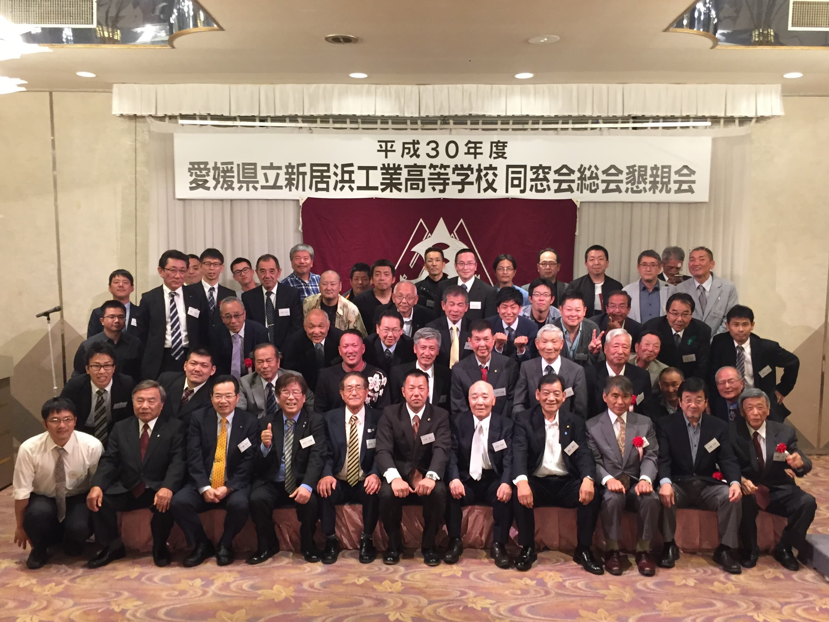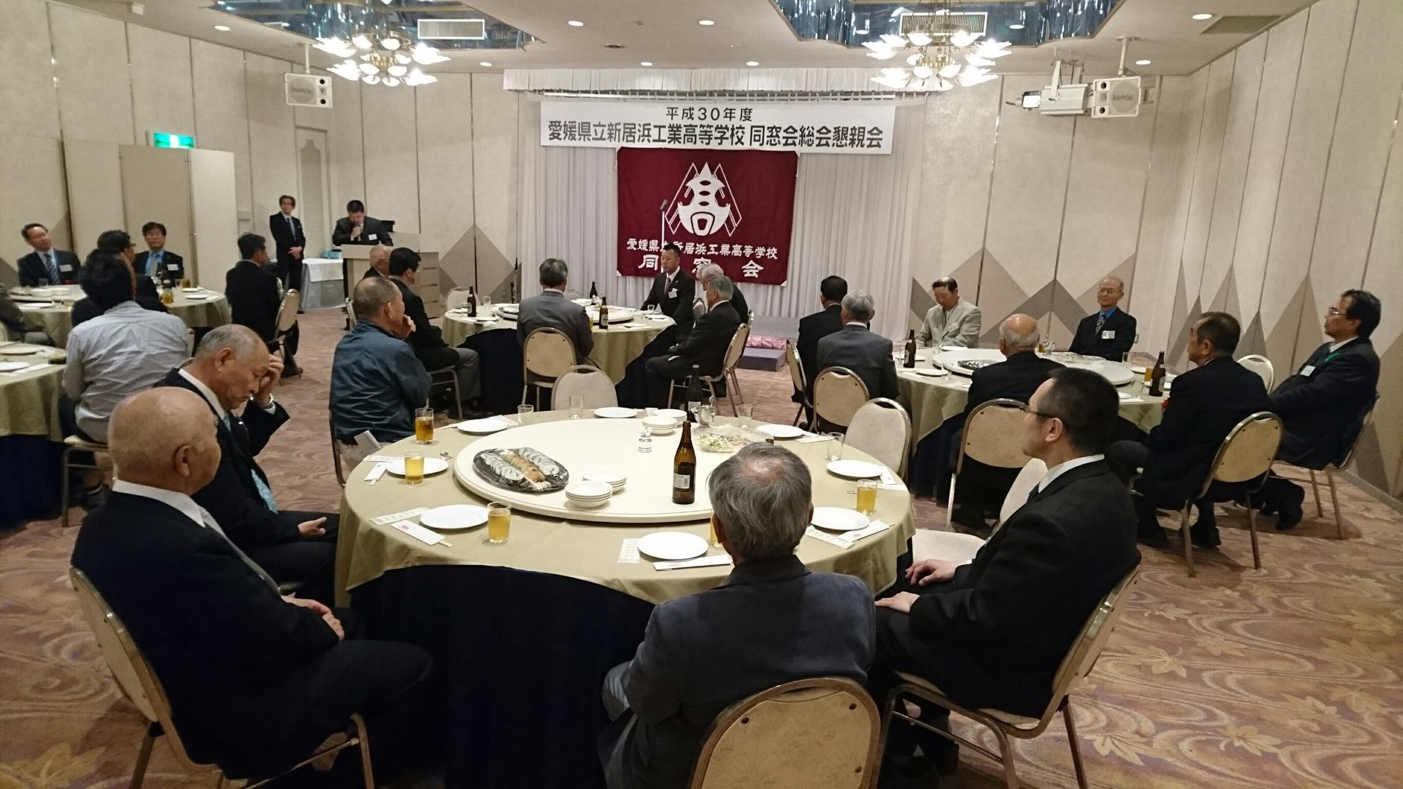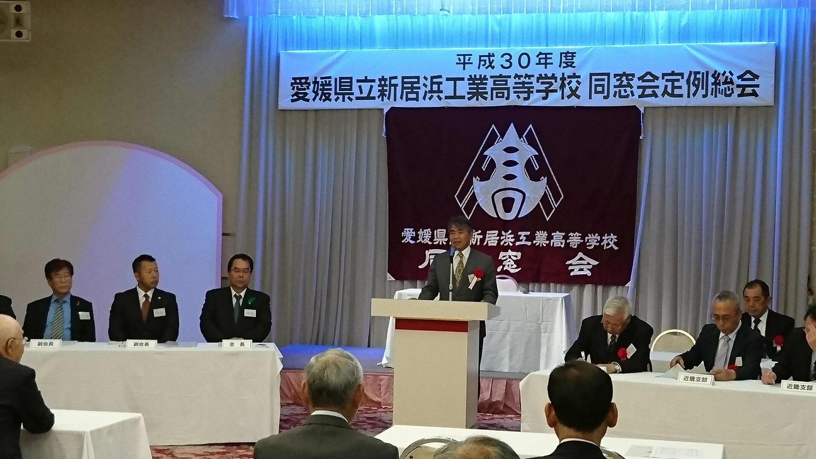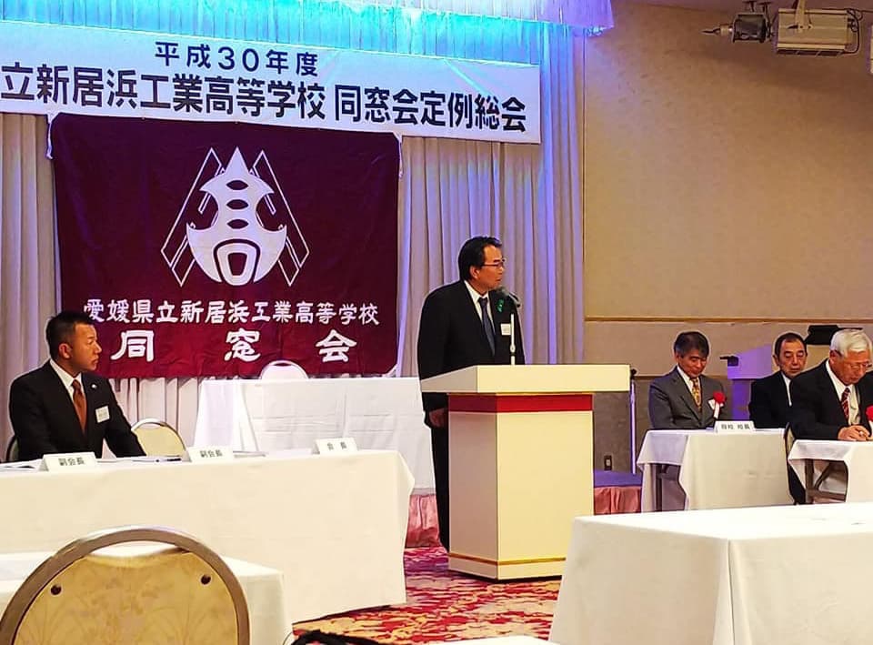 平成30年5月19日土曜日午後18時から、H30年度 愛媛県立新居浜工業高等学校同窓会定例総会が、執り行われました。今年は役員改選があり、8年間会長職を務められた田窪前会長に替わり、田坂新会長が誕生しました。