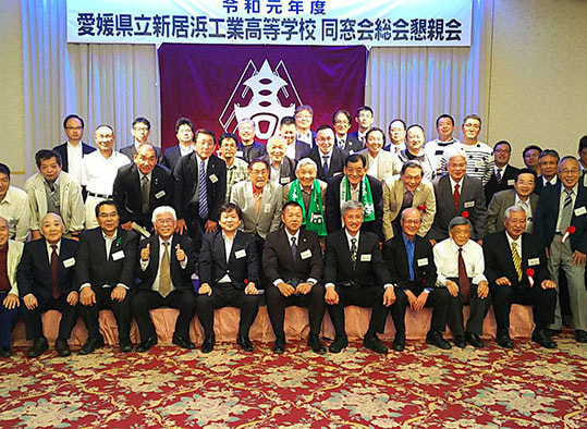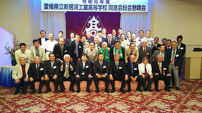 令和元年5月18日土曜日18:00~ユアーズに於いて、令和元年度愛媛県立新居浜工業高等学校同窓会総会が執り行われました。事業報告、会計監査も承認され、今回、田坂会長から提案された新居工同窓会独自の名称「連山会」を各支部でもご説明して来年の総会にて決定する運びも承認されました。その後の懇親会では、約50人が集い、昔の写真やアルバムを懐かしんだり、昨年の関東支部のDVDを観て楽しみました。最後は校歌斉唱、皆さん在学中には絶対だしてないであろう大きな声で歌っていました。皆さん来年も総会出席お願い致します。