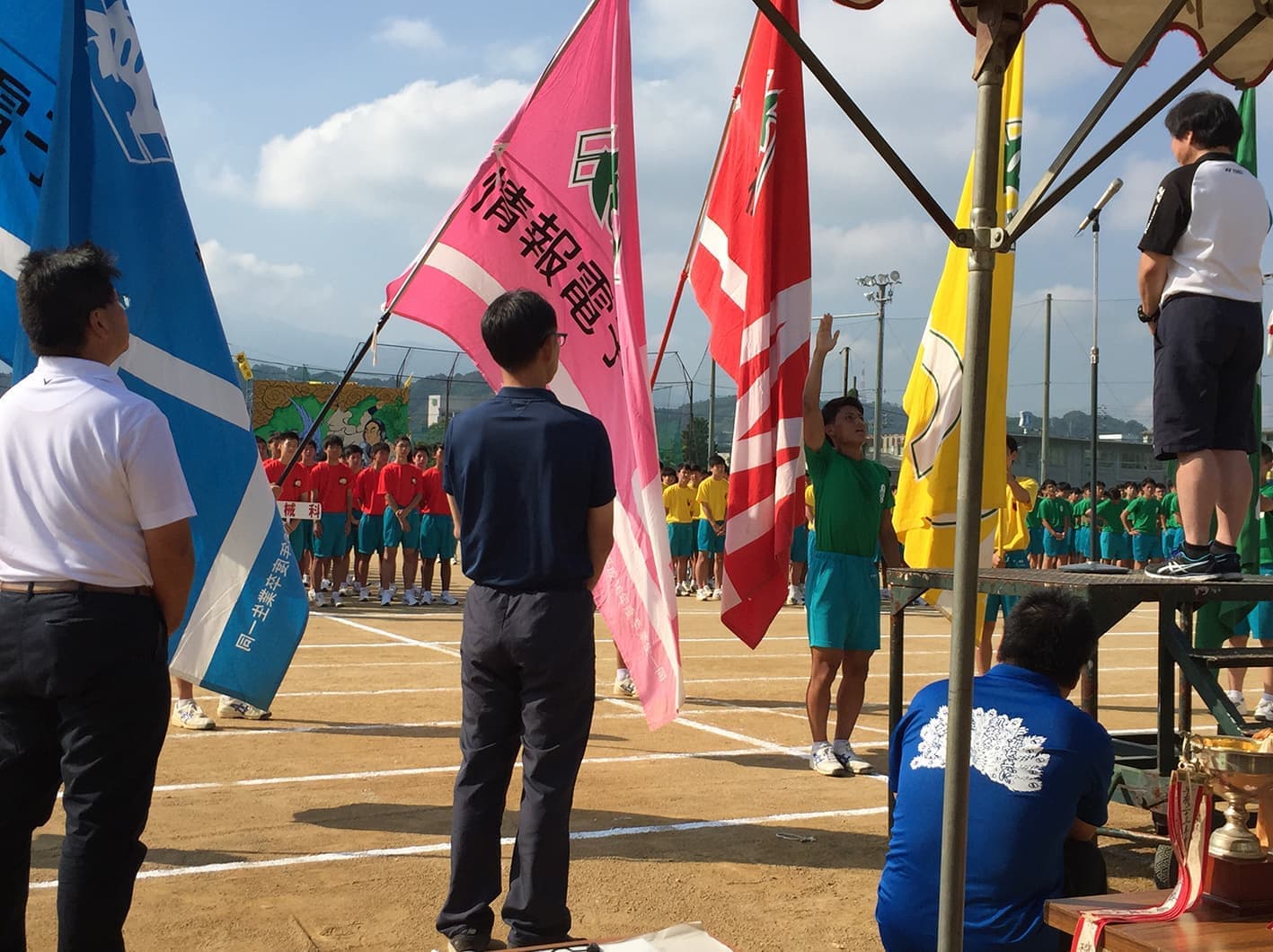 9/26(木)素晴らしい秋晴れの中、第68回新居工運動会が行われました。同窓会から、田坂会長、坪井副会長、檜垣副会長の3名が来賓参加し、来賓、教職員競技「パン食い競争」にも参加しました。生徒達の一生懸命競技をしている姿に感動、素晴らしい運動会でした。