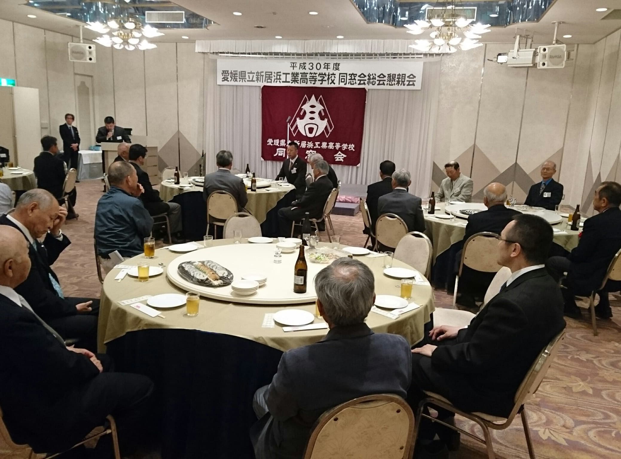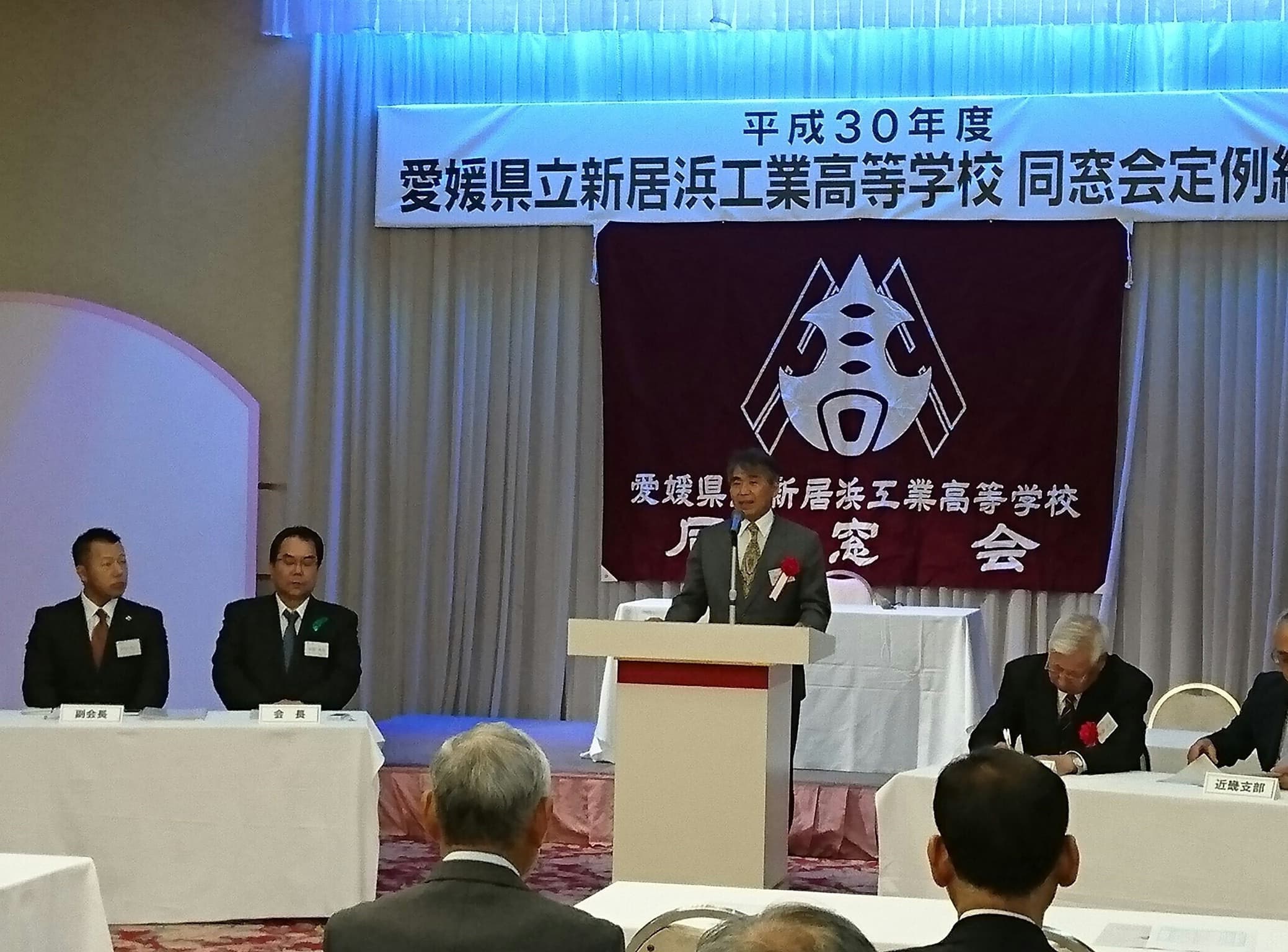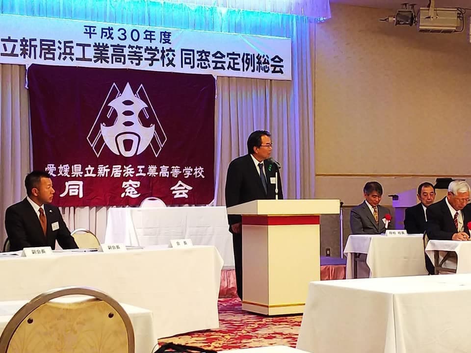 平成30年5月19日土曜日午後18時から、H30年度 愛媛県立新居浜工業高等学校同窓会定例総会が、執り行われました。今年は役員改選があり、8年間会長職を務められた田窪前会長に替わり、田坂新会長が誕生しました。